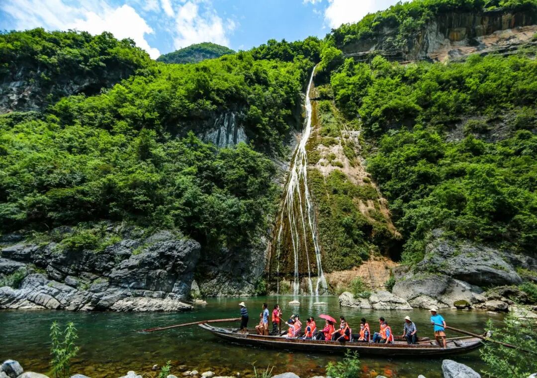 “快看!懸崖上真的有懸棺!”游船剛駛?cè)雿{谷深處,船艙內(nèi)便響起陣陣驚嘆。神農(nóng)溪是國家級風(fēng)景名勝區(qū)、國家5A級旅游景區(qū),發(fā)源于“華中屋脊”神農(nóng)架南麓,由北向南穿行于深山絕壁之間,最終匯入長江。兩岸絕壁如削,古棧道遺跡懸于半空,千年懸棺神秘肅穆,碧綠溪水倒映著峰巒疊翠——這幅“山在水中生,人在畫中游”的實景畫卷,讓地理與歷史課本上的文字瞬間變得觸手可及。