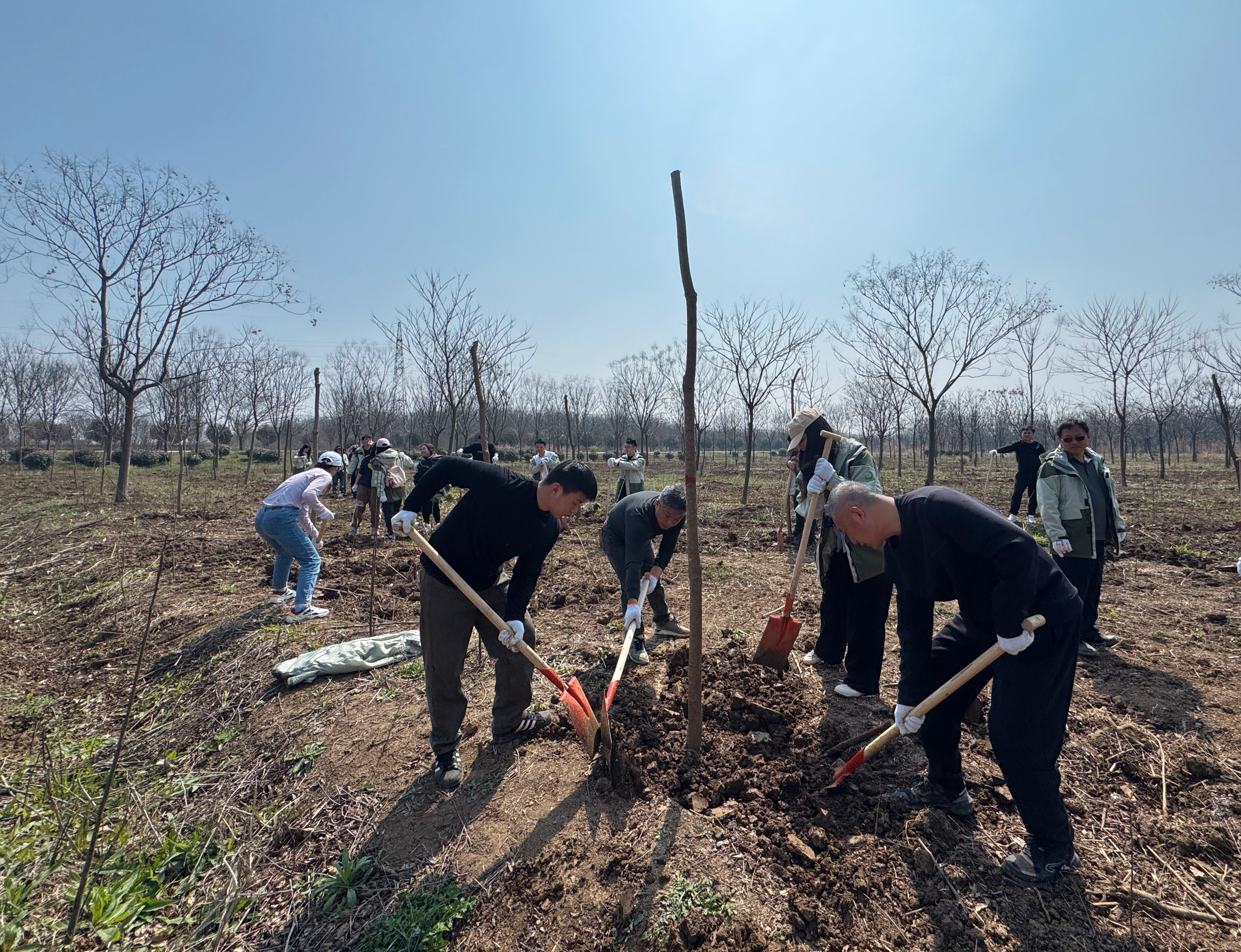 公司黨總支書記、董事長董良宇同志與職工一同揮鍬培土,并親切交流。黨總支委員、副總經(jīng)理陳剛、譚興同志一同參與植樹勞動(dòng)。
