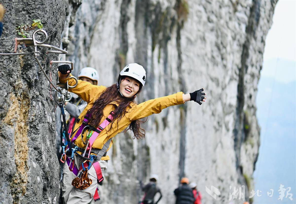 2月4日,游客在恩施大清江紅花峰林景區(qū)體驗飛拉達(dá)攀巖。