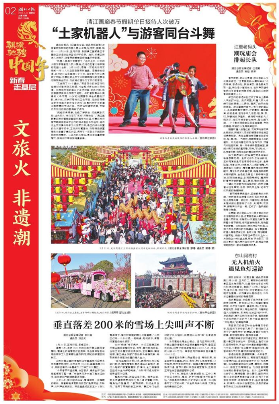 湖北日報訊?。ㄓ浾哧惲x超、通訊員楊金艷)與身著民族服飾的機器人同臺斗舞,搶繡球、套圈、拓印……2月20日,正月初四,長陽清江畫廊景區(qū)豐富的互動活動讓游客們大呼過癮。當天,該景區(qū)接待人次破萬,創(chuàng)春節(jié)假期單日接待量歷史新高。