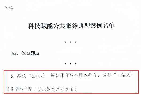 近日,國(guó)家發(fā)展改革委辦公廳等5部門聯(lián)合公布了一批“十四五”科技賦能公共服務(wù)典型案例名單,全國(guó)共30個(gè)案例。集團(tuán)旗下湖北體育產(chǎn)業(yè)集團(tuán)申報(bào)的《建設(shè)“去運(yùn)動(dòng)”數(shù)智體育綜合服務(wù)平臺(tái),實(shí)現(xiàn)“一站式”服務(wù)精準(zhǔn)匹配》成功入選,是湖北省唯一入選的體育領(lǐng)域案例。
