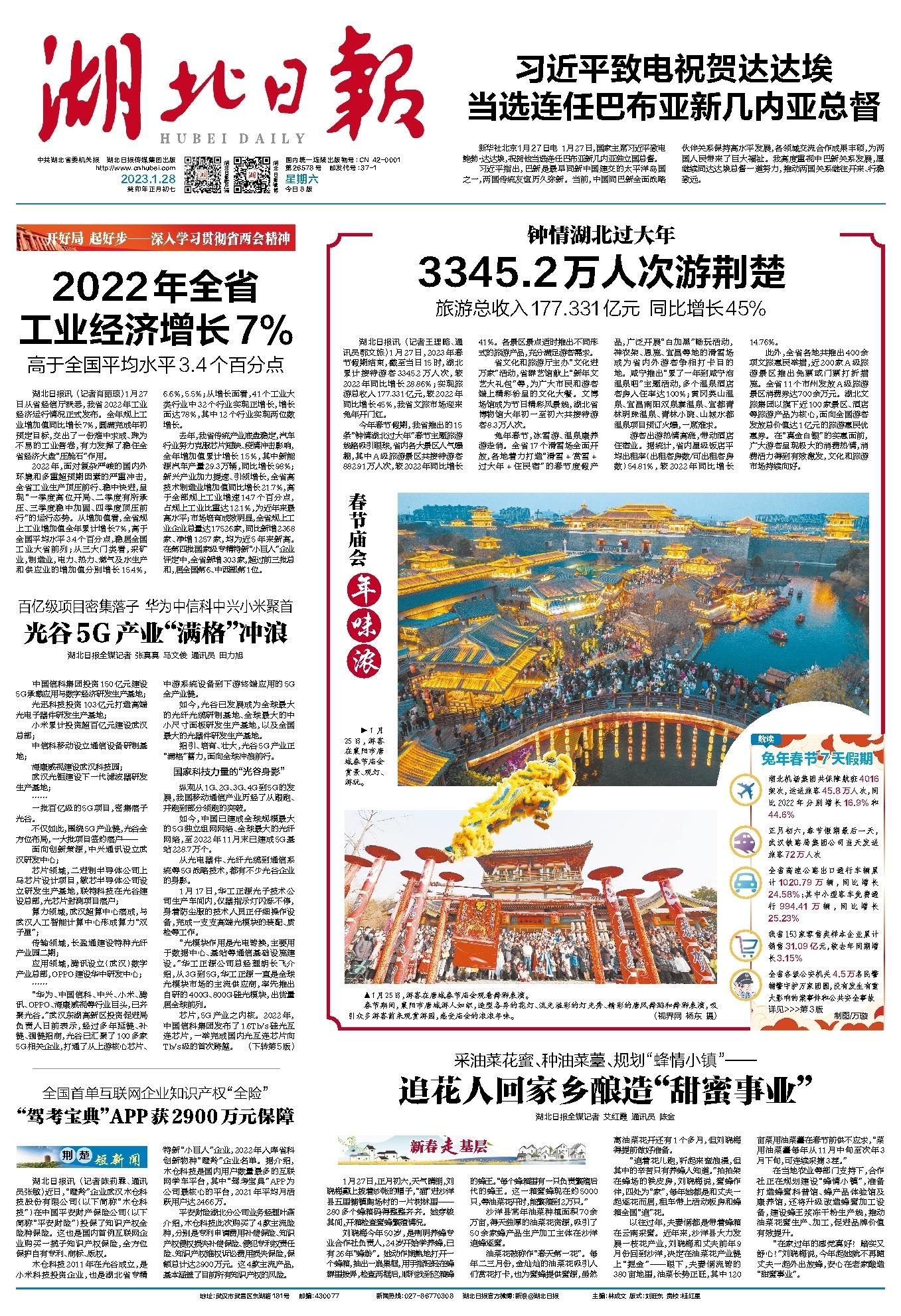 湖北日報(bào)訊 (記者王理略、通訊員鄂文旅)1月27日,2023年春節(jié)假期結(jié)束,截至當(dāng)日15時(shí),湖北累計(jì)接待游客3345.2萬人次,較2022年同比增長28.86%;實(shí)現(xiàn)旅游總收入177.331億元,較2022年同比增長45%,我省文旅市場迎來兔年開門紅。