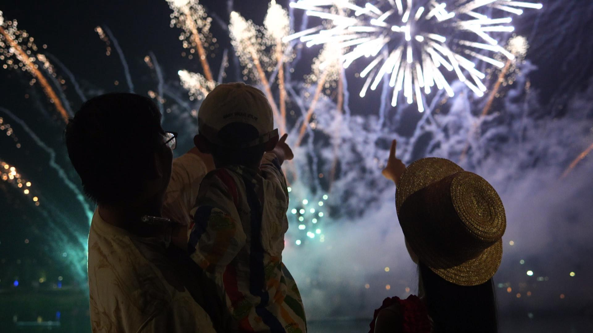 夜幕降臨時,無人機焰火秀更是成為重頭戲,百架無人機在空中變換出“五星紅旗”“我愛你中國”等圖案,與絢麗的焰火交相輝映,讓現(xiàn)場觀眾嘆為觀止。