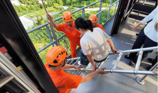 上午7時,演練正式啟動。本次地面纜車演練模擬“因突發(fā)電路故障,纜車中途停滯,8名乘客滯留轎廂”的緊急場景。接到報警后,大峽谷事業(yè)部應急指揮中心立即啟動《地面纜車應急救援預案》,迅速集結救援人員展開救援。設備保障組通過故障代碼鎖定故障位置;醫(yī)療組攜帶急救箱抵達現(xiàn)場,對“受困乘客”進行情緒安撫及基礎健康檢查;疏散引導組則通過擴音設備向乘客說明救援進展,避免恐慌。僅18分鐘,8名“受困乘客”全部安全抵達纜車站臺,故障設備完成初步檢修并恢復運行。