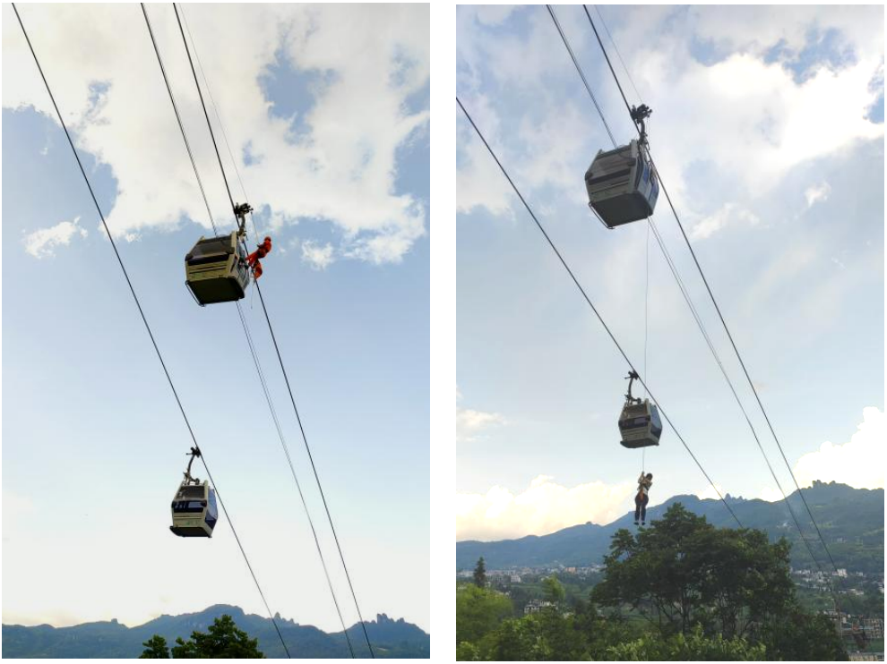 垂直救援模擬“索道支架區(qū)域因雷擊導致一根鋼索斷裂,2名乘客滯留高空轎廂中”,救援人員通過支架及繩索速降技術抵達轎廂頂部,利用專業(yè)破拆工具開啟艙門,采用“一對一”背負式救援將乘客轉移至地面,并組織地面救護人員對乘客進行安撫和檢查。