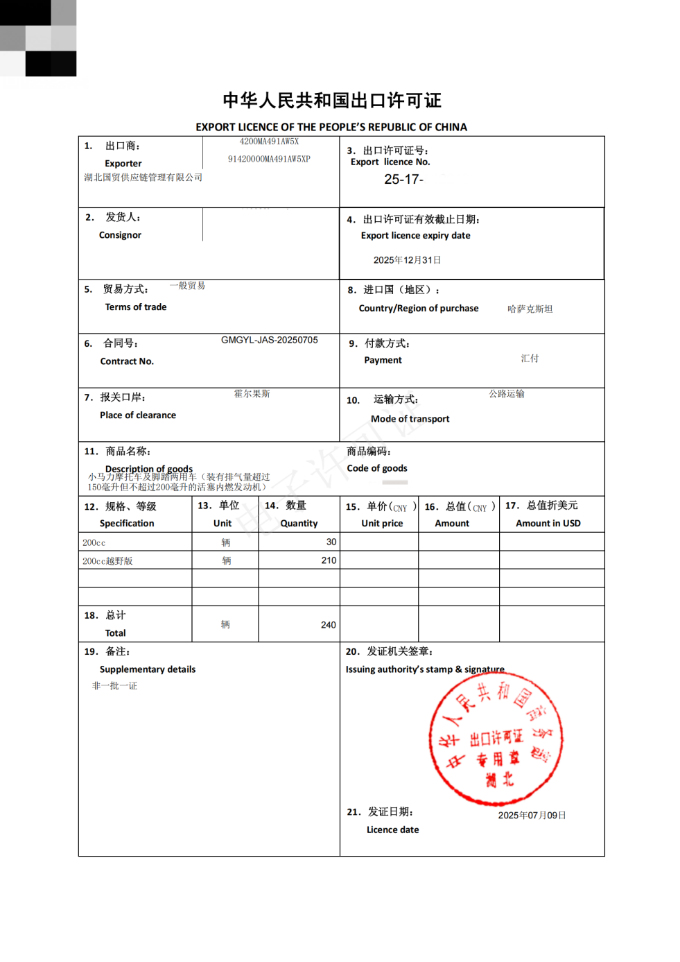 7月20日,湖北國(guó)貿(mào)集團(tuán)旗下國(guó)貿(mào)供應(yīng)鏈公司自主運(yùn)營(yíng)的首批240臺(tái)國(guó)產(chǎn)摩托車,經(jīng)霍爾果斯口岸順利通關(guān)并成功運(yùn)抵哈薩克斯坦阿拉木圖市。這標(biāo)志著集團(tuán)在出口領(lǐng)域再次實(shí)現(xiàn)突破,全球化供應(yīng)鏈體系建設(shè)邁上新臺(tái)階。